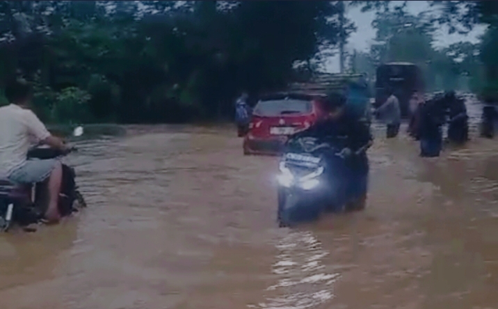 Luapan banjir juga menggenangi jalan dengan ketinggian hingga 60 cm, mengakibatkan puluhan sepeda motor mati dan satu unit mobil terseret arus.